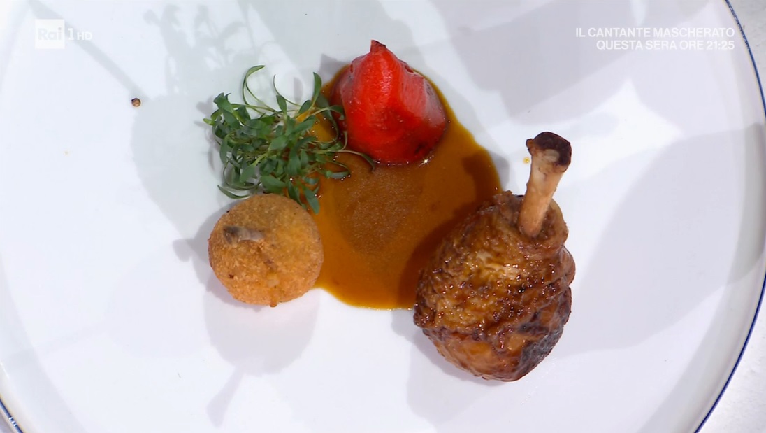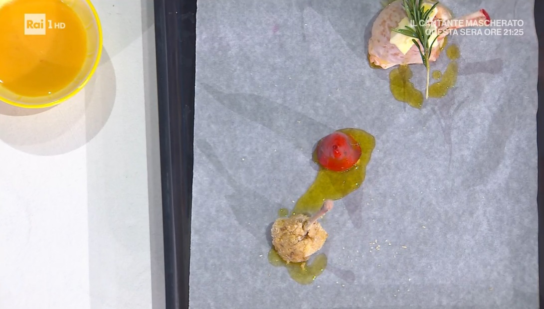 Sulla teglia, quindi, disponiamo le alette, il peperone farcito e la coscia di pollo con sopra burro, olio e rosmarino. Cuociamo in forno caldo e statico a 180° per 25 minuti.
