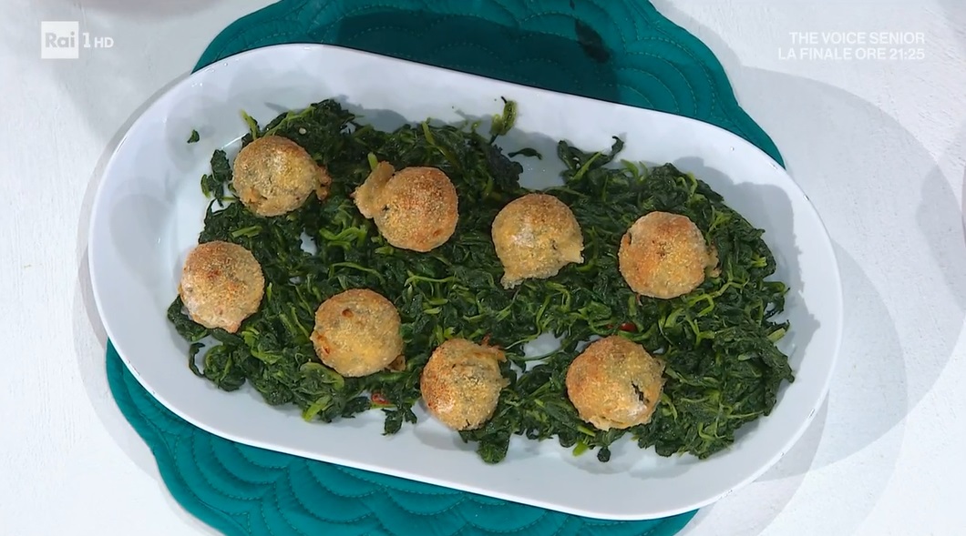 Con le mani bagnate, formiamo delle polpette grandi come mandarini. Le passiamo nella farina, nelle uova sbattute e infine nel pangrattato. Le disponiamo su una teglia con carta forno e cuociamo in forno caldo a 180° per 20 minuti.