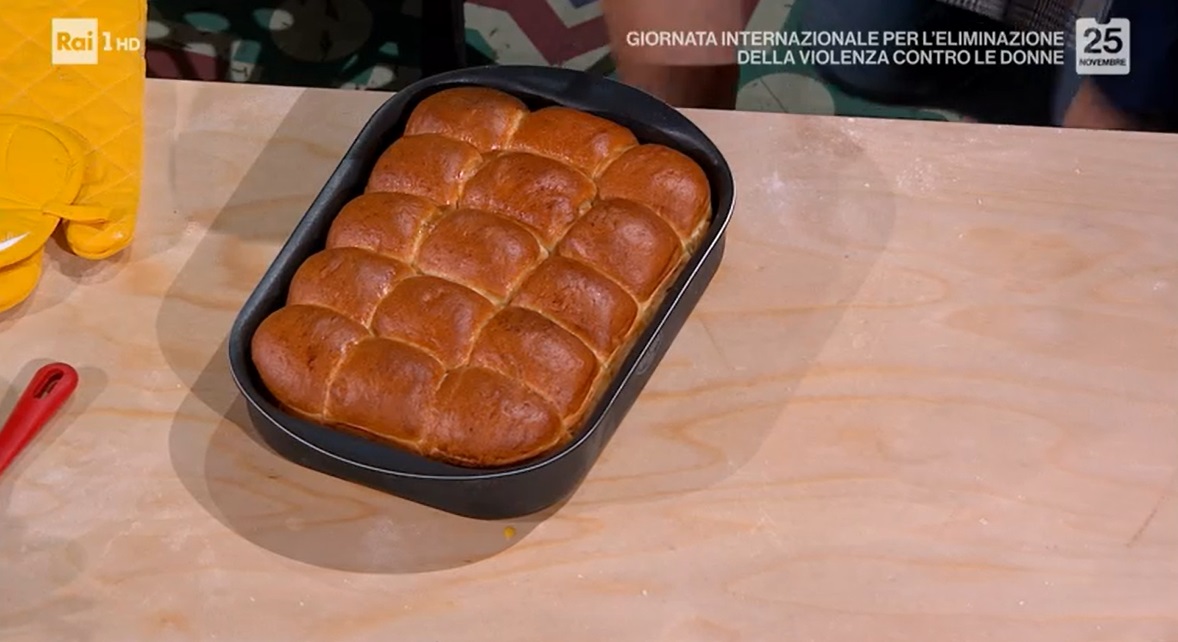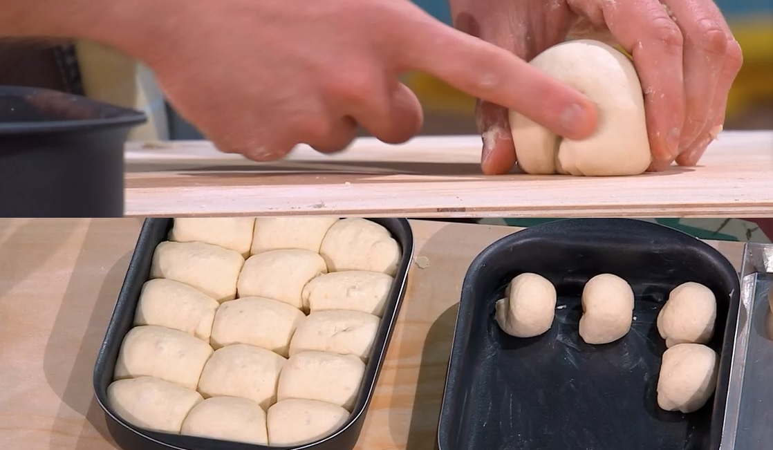 Prendiamo ogni pallina, la stendiamo con il matterello, in modo da creare una lingua, che arrotoliamo su se stessa. Arrotondiamo il panino, roteandolo con la mano sul piano: otterremo una sorta di chiocciolina. Inseriamo i panini in una teglia ben imburrata, distanziandoli di 1 cm (15 panini in una teglia 20×30). Copriamo e lasciamo lievitare fino al raddoppio: devono unirsi e riempire la teglia. Spennelliamo con l’uovo sbattuto e cuociamo in forno caldo e statico a 190° per 30 minuti.
