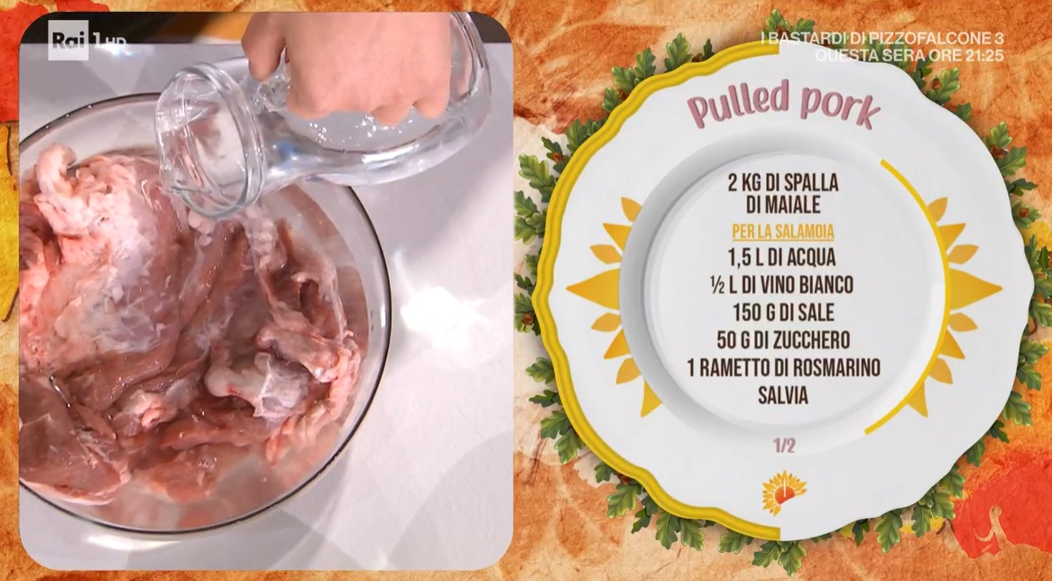 Mettiamo la spalla del maiale in una ciotola capiente e la copriamo con l’acqua, vino bianco, rosmarino, salvia, bacche di ginepro, zucchero, sale. Copriamo e lasciamo riposare per 3 ore in frigorifero.