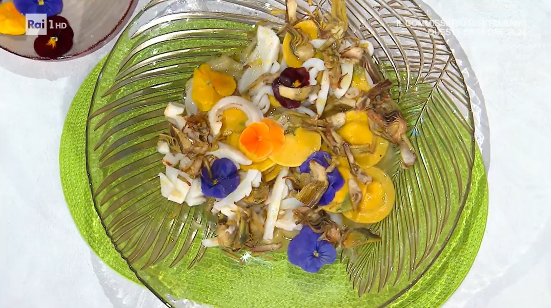 Puliamo le seppie e le incidiamo in superficie, in modo da formare un reticolato. Le tagliamo a listarelle e le saltiamo in una padella rovente, con un filo d’olio ed uno spicchio d’aglio. Uniamo i carciofi a fettine già rosolati. Lasciamo insaporire qualche istante.