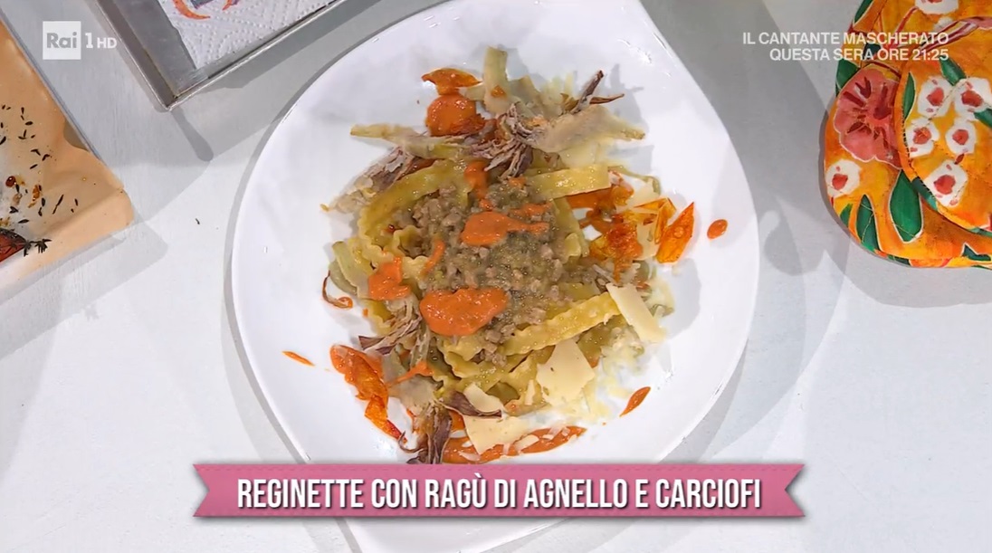 Sul piatto da portata, distribuiamo un po’ di crema di carciofi, un po’ di crema di pomodorini e adagiamo sopra le reginette al ragù. Finiamo con i carciofi fritti e scaglie di pecorino.