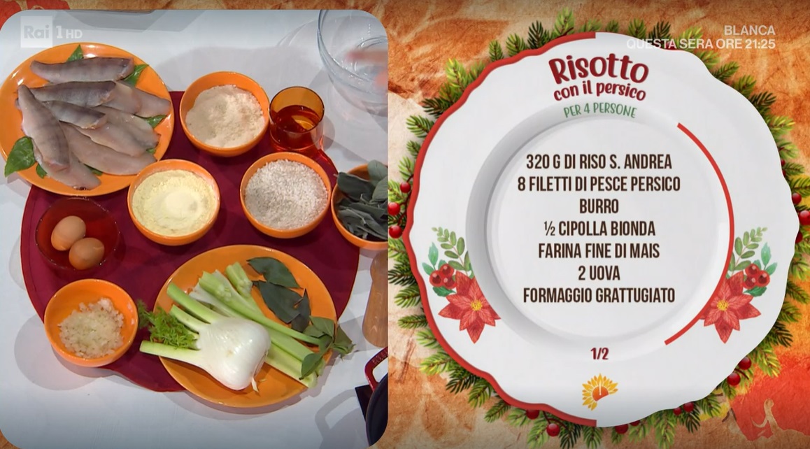 - 320 g riso S Andrea, 8 filetti di pesce persico, burro, mezza cipolla bionda, farina di mais, 2 uova, formaggio grattugiato, mezzo bicchiere vino bianco, 12 foglie di salvia, alloro, sale