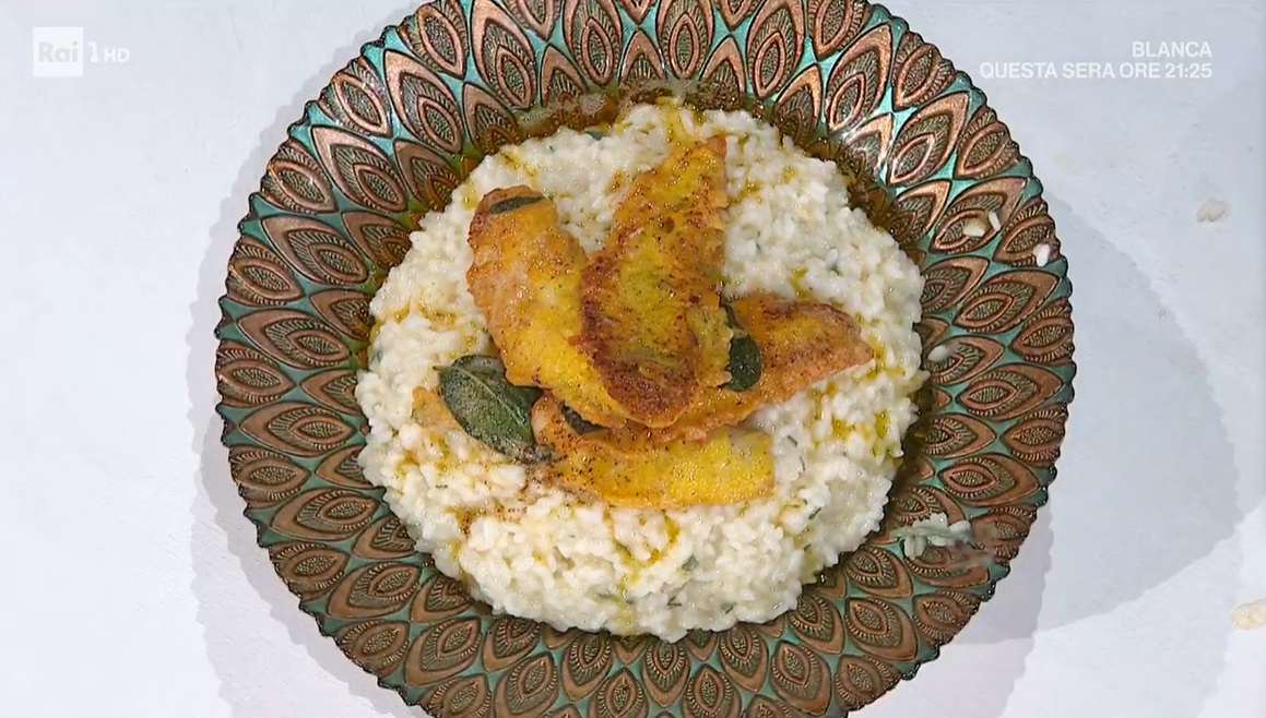 Passiamo al risotto: in un tegame, mettiamo a tostare il riso con una generosa noce di burro e foglie di salvia. Sfumiamo con il vino bianco e bagniamo con il brodo di pesce persico (con gli scarti del pesce e le verdure). Portiamo a cottura, aggiungendo il brodo. Quando il riso è cotto, spegniamo e mantechiamo con burro, parmigiano grattugiato e qualche cucchiaio del burro usato per friggere il persico. Serviamo con sopra i filetti di persico.
