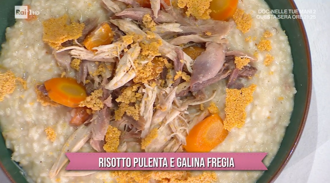 Mettiamo a tostare il riso con una noce di burro. Bagniamo con il brodo di gallina e, a metà cottura, aggiungiamo la patata cruda grattugiata. Portiamo il risotto a cottura, aggiungendo il brodo quando serve. Quando il riso è cotto, mantechiamo con il formaggio magro Bellagio a dadini, del parmigiano grattugiato ed una noce di burro. Quando il Bellagio si è sciolto, uniamo parte dell’insalata di gallina e spegniamo il fuoco. Serviamo il risotto con sopra l’insalata di gallina rimasta ed il croccante sbriciolato.