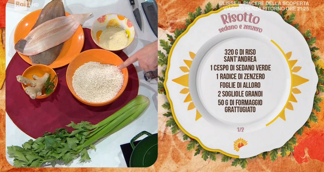 In un tegame, facciamo tostare il riso a secco, solo con qualche foglia di salvia. Bagniamo con il brodo (preparato con gli scarti della sogliola, sedano, carota e cipolla) e portiamo a cottura, aggiungendo man mano il brodo. A 2/3 di cottura del riso, aggiungiamo l’estratto di sedano e portiamo a cottura. Alla fine, aggiungiamo un po’ di estratto di zenzero e mantechiamo con una noce di burro.
