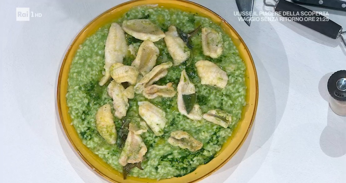 Serviamo il risotto con sopra le foglie di sedano tritate, gli straccetti di sogliola ed il loro fondo di cottura.