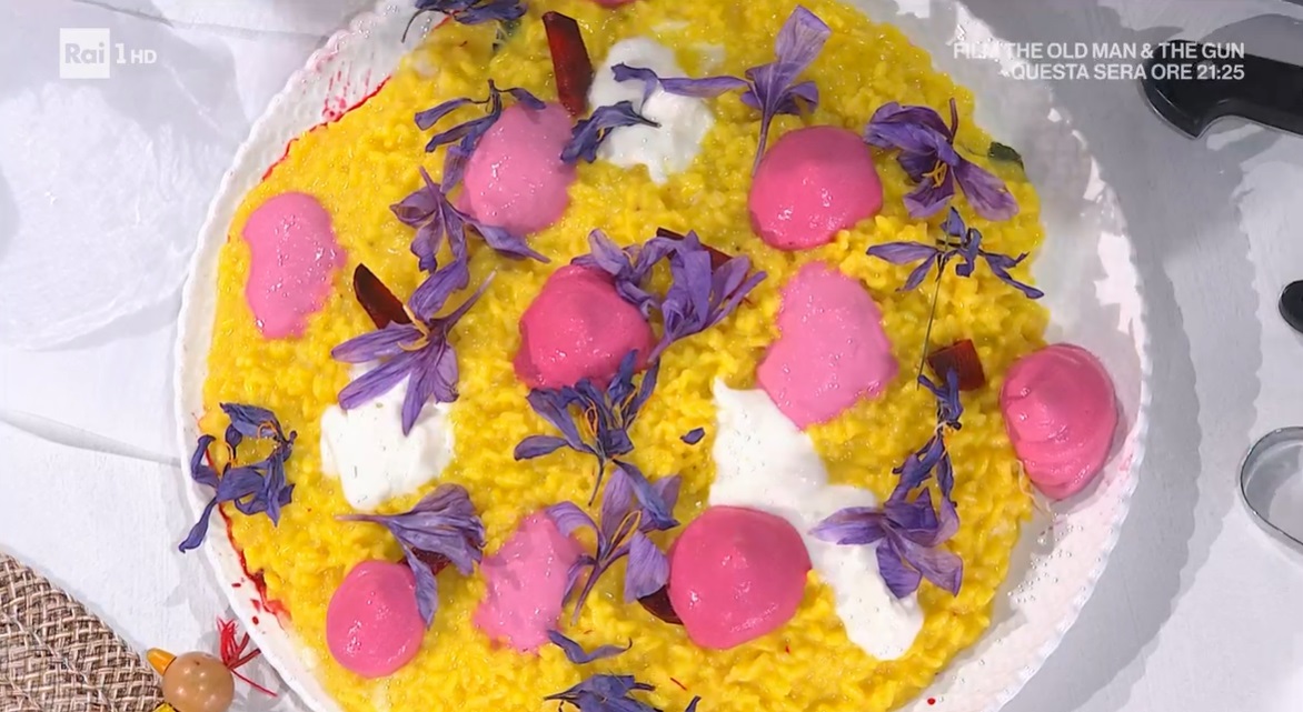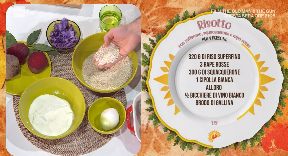 - 320 g riso superfino, 3 rape rosse, 300 g squacquerone, 1 cipolla bianca, alloro, mezzo bicchiere di vino bianco, brodo di gallina, 0,1 g pistilli di zafferano, 50 g panna fresca, 30 g burro, 80 g formaggio grattugiato, olio evo, sale e pepe