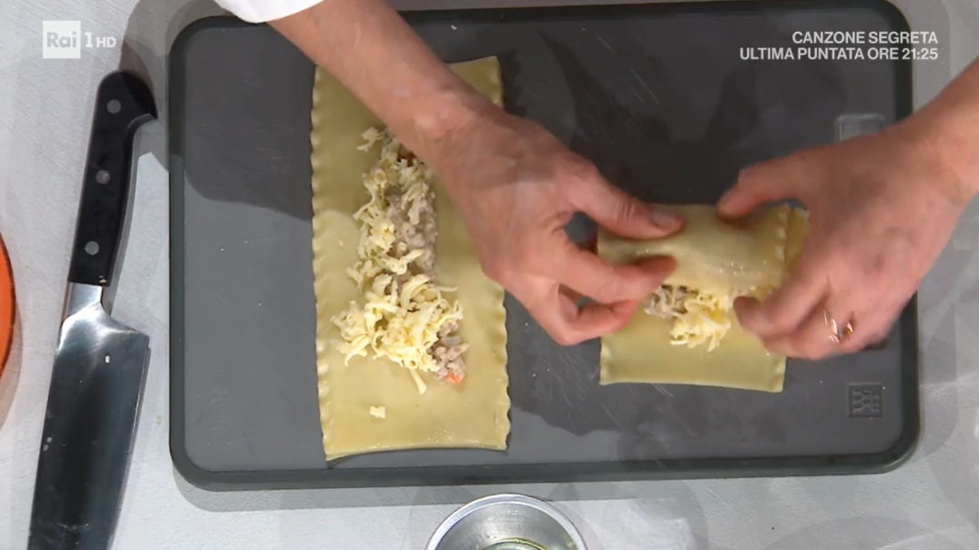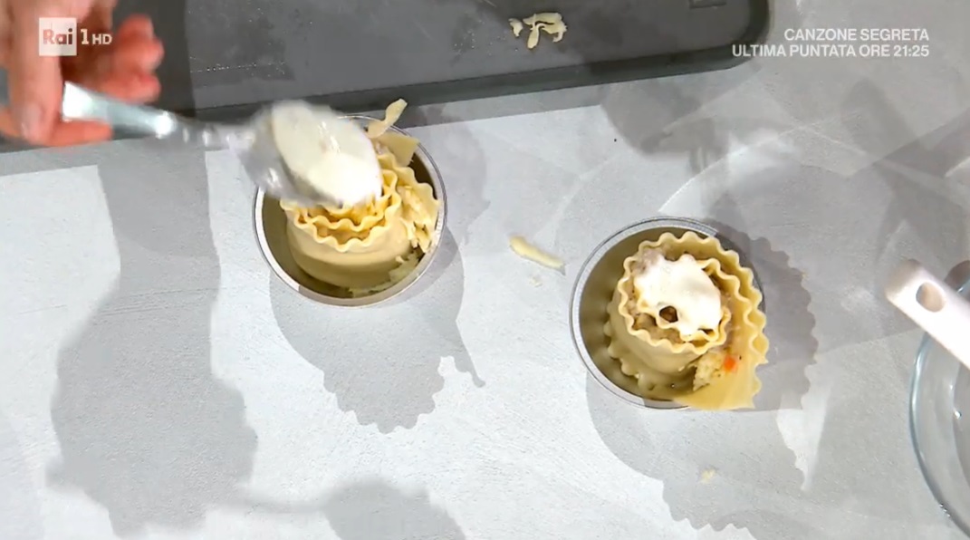 Prendiamo una lasagna riccia sbollentata, le saliamo e spalmiamo sopra, al centro, due cucchiai di composto. sovrapponiamo un’altra lasagna e spalmiamo sopra ancora un cucchiaio di ripieno e della scamorza affumicata tritata. A questo punto, arrotoliamo la pasta sul ripieno, partendo dal lato corto. Inseriamo la rosa ottenuta all’interno di uno stampino monoporzione ben unto. Distribuiamo sopra un cucchiaio di besciamella, una spolverata di parmigiano e copriamo con un foglio di alluminio. Mettiamo in forno caldo a 180° per 15 minuti, togliamo la carta e lasciamo cuocere ancora 7 minuti.