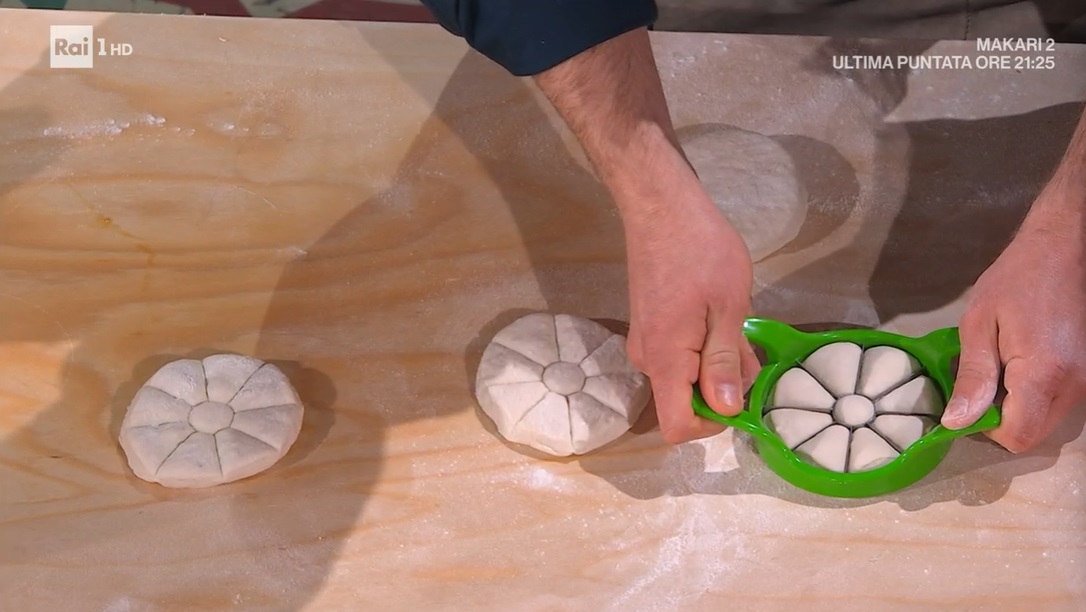 Stendiamo nuovamente, con il mattarello, ad uno spessore di 1 cm. Ricaviamo dei dischi del diametro di 10 cm. Con il taglia mela premiamo su ogni disco, arrivando quasi fino al fondo. Disponiamo le rosette sulla teglia, capovolte, copriamo e lasciamo lievitare per 40 minuti. Le capovolgiamo nuovamente sulla stessa teglia e le cuociamo in forno caldo a 250° per 14 minuti, solo dopo aver spruzzato un po’ d’acqua all’interno.