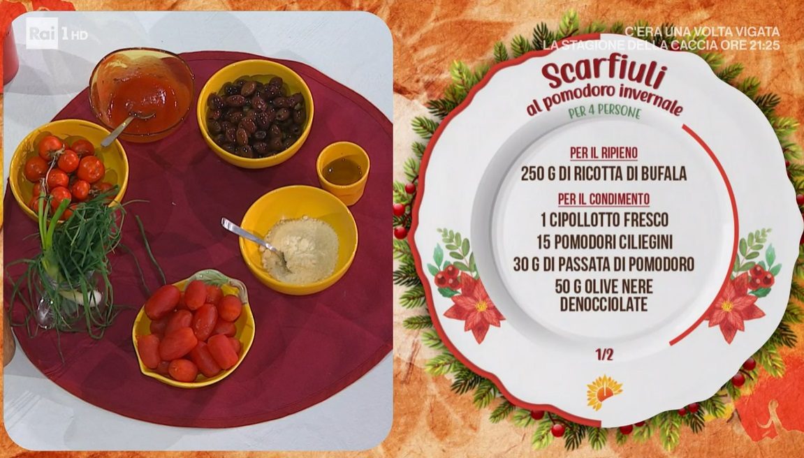 - Condimento: 1 cipollotto, 15 pomodori ciliegini, 30 g passata di pomodoro, 50 g olive nere denocciolate, erba cipollina, 30 g formaggio grattugiato, 20 ml olio evo, sale e pepe