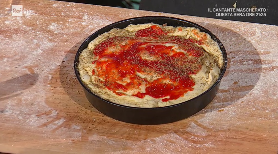 Prendiamo una teglia da 32 cm oliata. Allarghiamo un panetto su un piano e lo trasferiamo all’interno della teglia, lasciando i bordi un po’ più alti.