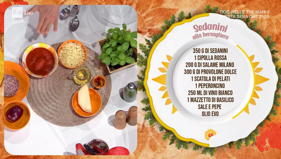 - 350 g sedanini, 1 cipolla rossa, 200 g salame milano, 300 g provolone dolce, 1 scatola di pelati, 1 peperoncino, 250 ml vino bianco, 1 mazzetto di basilico, sale e pepe, olio evo