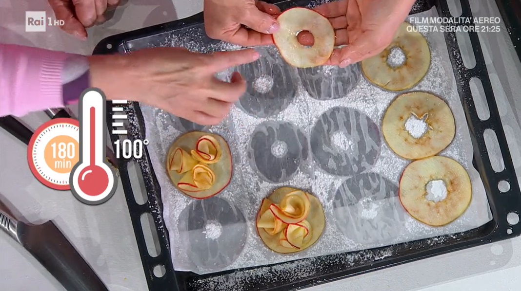 Tagliamo la mela a fettine sottili, con una mandorlina, in modo da ottenere degli anelli. Disponiamo quest’ultimi su una teglia con carta forno e spolveriamo con lo zucchero a velo. Passiamo in forno caldo a 100° per 10 minuti: diventeranno morbide. Con le mele ammorbidite formiamo delle roselline e le rimettiamo in forno a 100° per 3 ore.