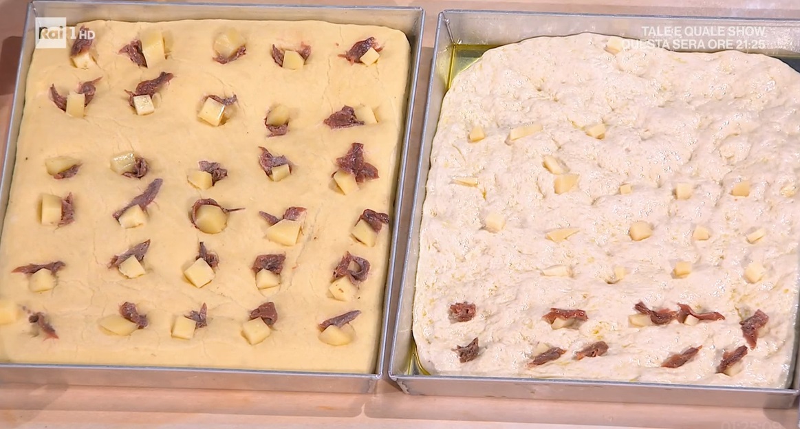 Inseriamo nell’impasto il caciocavallo a dadini e le acciughe sott’olio a pezzettini. Copriamo e lasciamo lievitare per circa mezz’ora: deve raddoppiare e raggiungere quasi i bordi della teglia. A questo punto, spalmiamo sopra la salsa con le cipolle, senza sgonfiare l’impasto. Spolveriamo con il caciocavallo grattugiato ed il pangrattato. Cuociamo in forno statico e caldo a 250° per 25 minuti. Appena sfornata, finiamo con un filo d’olio a crudo e dell’origano.