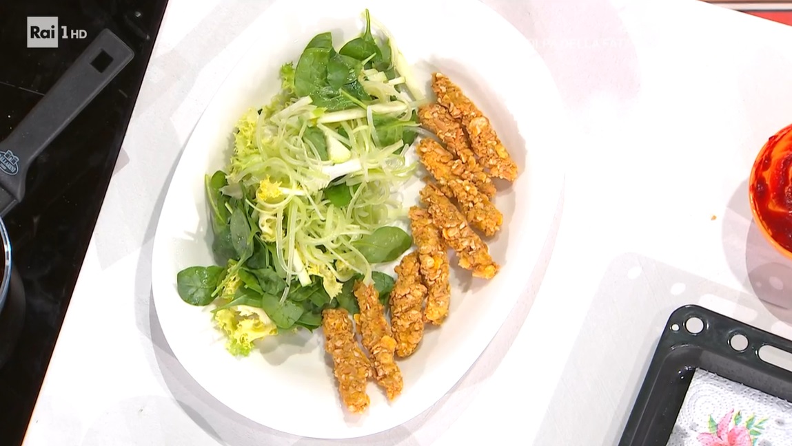 Per la panatura, in una ciotola mescoliamo i corn flakes con il pangrattato, i grissini sbriciolati, le mandorle in granella ed il sesamo tostato. Passiamo il pollo marinato nella pastella e, successivamente, nella panatura mista. Immergiamo il pollo impanato nell’olio caldo (a 170°) e profondo.