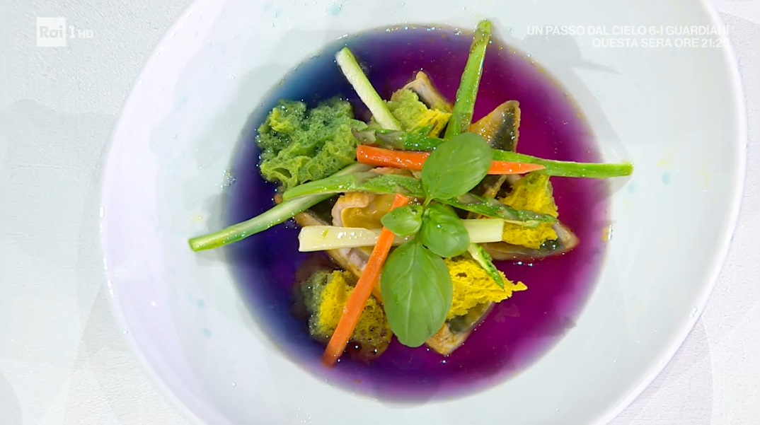 Componiamo: adagiamo sul fondo del piatto i pomdorini, sopra il pesce sgocciolato. Disponiamo intorno la spugna a pezzettoni e sopra le verdure saltate. Coliamo intorno l’acqua blu (al cavolo e zenzero).