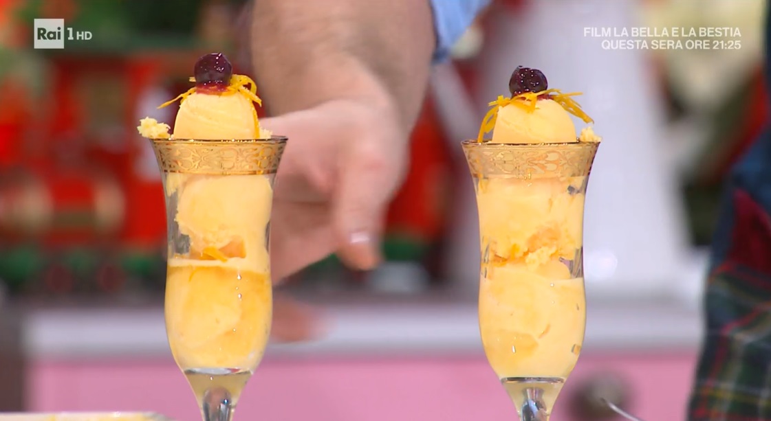 Serviamo il sorbetto all’interno nei flûte. Mettiamo una pallina di sorbetto, irroriamo con lo spumante e mettiamo qualche zeste di scorza di mandarino. Ancora una pallina di sorbetto e finiamo con zeste di mandarino e un’amarena sciroppata.