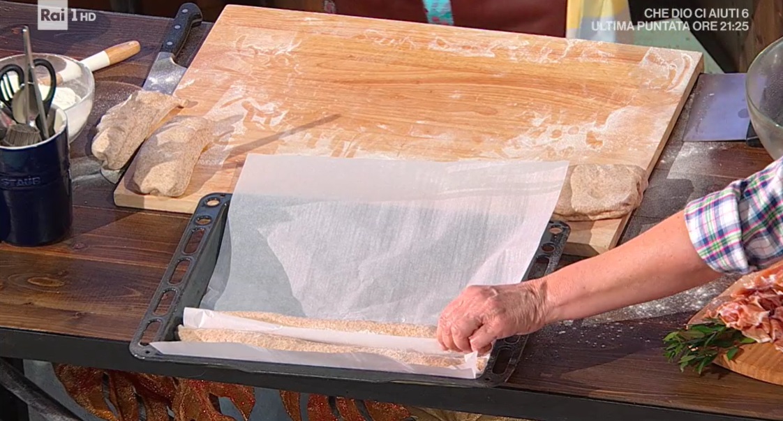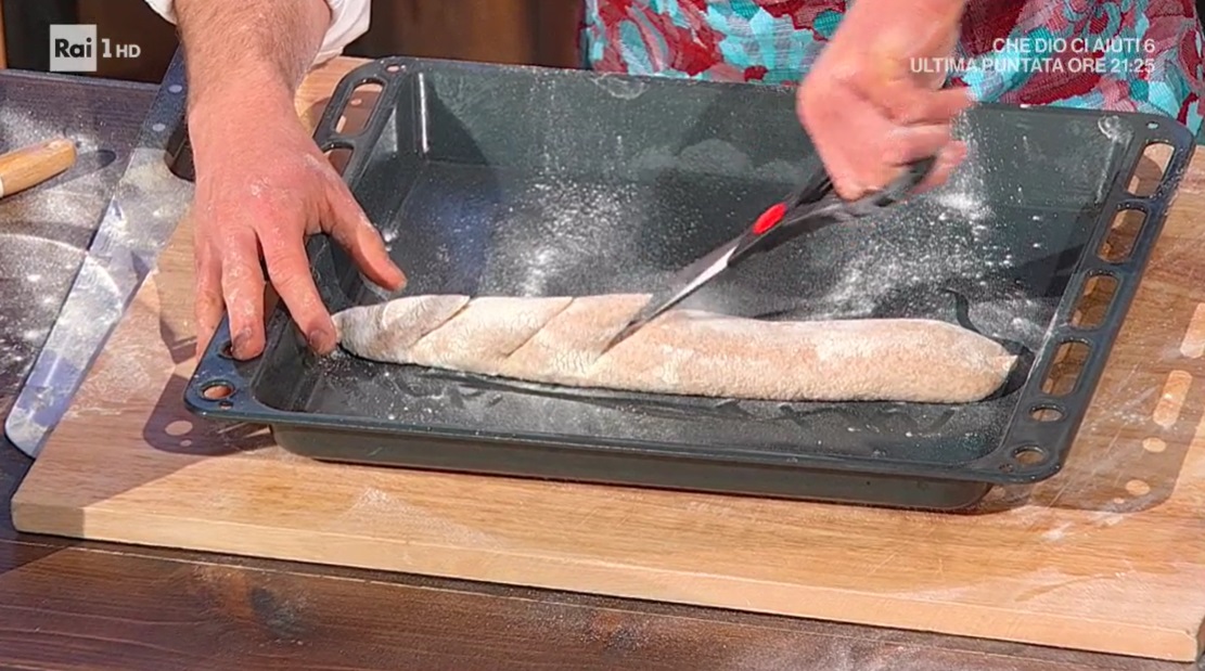Ricaviamo dei panetti di circa 300 g. Allarghiamo ogni panetto sul piano infarinato in modo da formare un rettangolo, lo arrotoliamo su se stesso dal lato lungo, in modo da formare un filoncino, che allunghiamo sulle punte come fosse una baguette. Disponiamo quest’ultime su una teglia coperta con carta forno infarinata, una di fianco all’altra, intervallate da carta forno. Copriamo e lasciamo riposare altri 20 minuti.