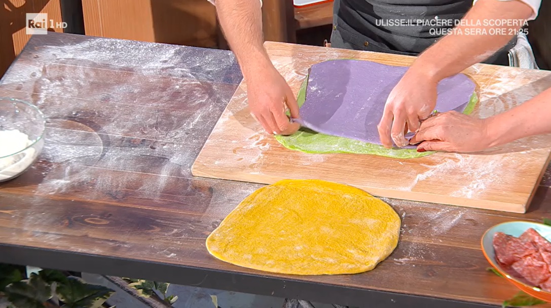 - Impasto verde: 250 g farina 0, 5 g lievito di birra, 120 estratto di rucola, 5 g sale, 20 g olio evo