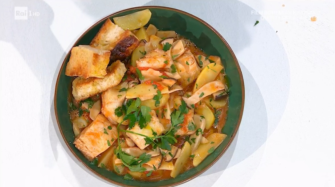 Peliamo le patate, le tagliamo a spicchi e le sbollentiamo per 3-4 minuti in acqua bollente. Scoliamo e le uniamo al sugo di funghi. Uniamo anche lo stoccafisso in trancetti, sale, copriamo con il brodo vegetale e mettiamo il coperchio. Lasciamo cuocere per 15 minuti. Serviamo con crostoni di pane e prezzemolo tritato.