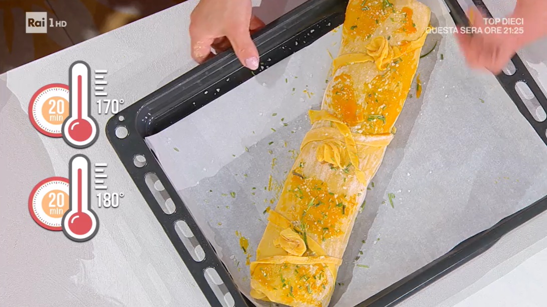 Sul rettangolo di sfoglia, disponiamo lo speck affettato, lasciando liberi i bordi. Distribuiamo sopra il ripieno di carne e, ancora sopra, la fontina a dadini. Ripieghiamo la sfoglia sul ripieno, aiutandoci con il canovaccio e dando la forma tipica dello strudel. Posizioniamo quest’ultima sulla teglia con carta forno, decoriamo a piacere e spennelliamo con il tuorlo sbattuto con un filo d’olio di semi. Spolveriamo con rosmarino tritato e sale grosso e cuociamo in forno caldo e statico a 180° per 20 minuti; abbassiamo a 170° e lasciamo cuocere ancora 20 minuti.