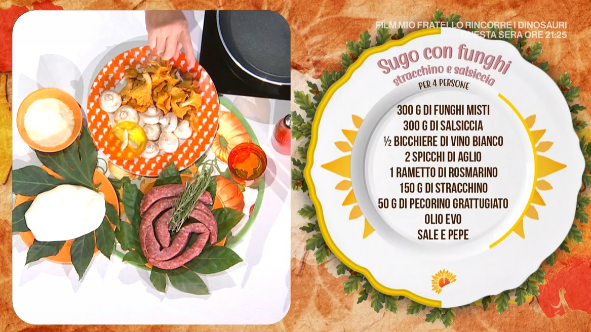 - 300 g funghi misti, 300 g salsiccia, mezzo bicchiere di vino bianco, 2 spicchi d’aglio, 1 rametto di rosmarino, 150 g stracchino, 50 g pecorino grattugiato, olio, sale e pepe