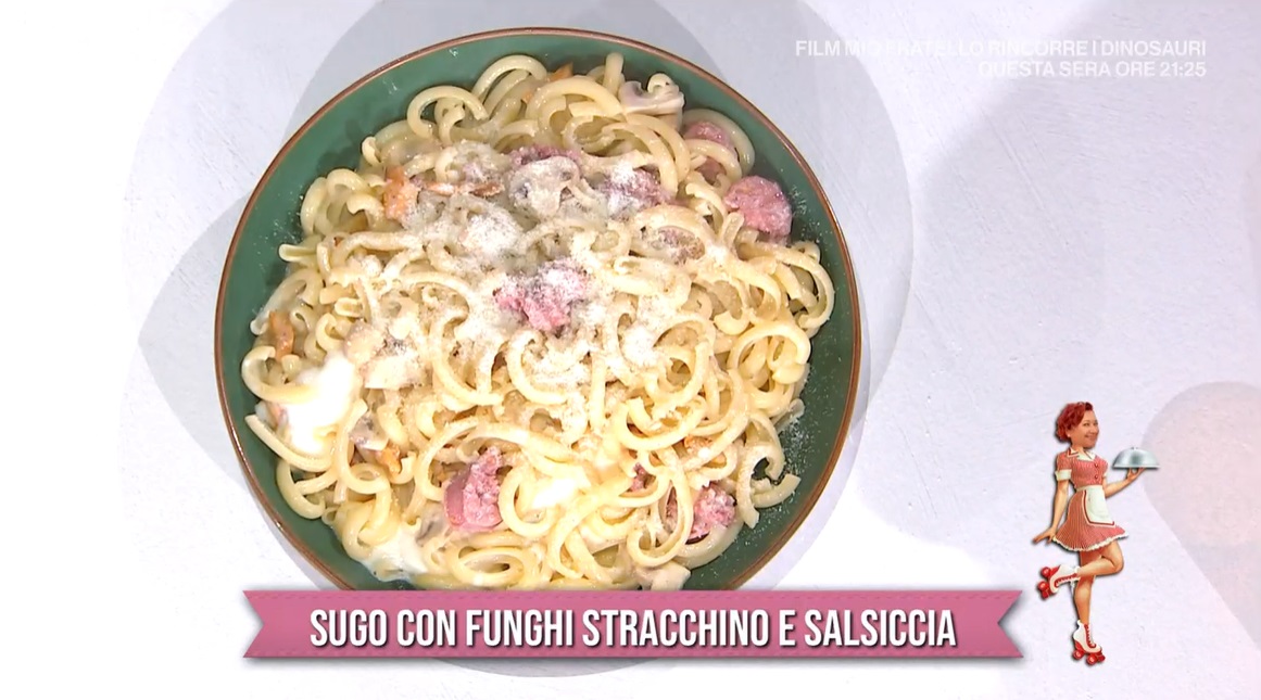 Scoliamo la pasta al dente e la saltiamo in padella con il condimento. Aggiungiamo lo stracchino ed il formaggio grattugiato e mantechiamo qualche istante sul fuoco.