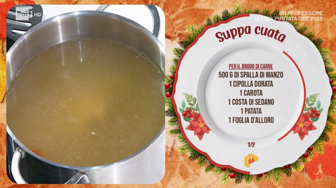 - Brodo di carne: 500 g spalla di manzo, 1 cipolla dorata, 1 carota, 1 costa di sedano, 1 patata, 1 foglia di alloro, 1 pomodoro secco, 2 l acqua, sale