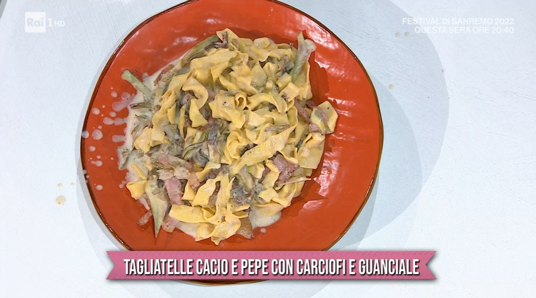 Cuociamo la pasta in acqua bollente e salata, la scoliamo e la saltiamo in padella con i carciofi. Spegniamo il fuoco, uniamo la crema di pecorino e mescoliamo rapidamente, aggiungendo un po’ di acqua della pasta se occorre. Serviamo con il guanciale rosolato.