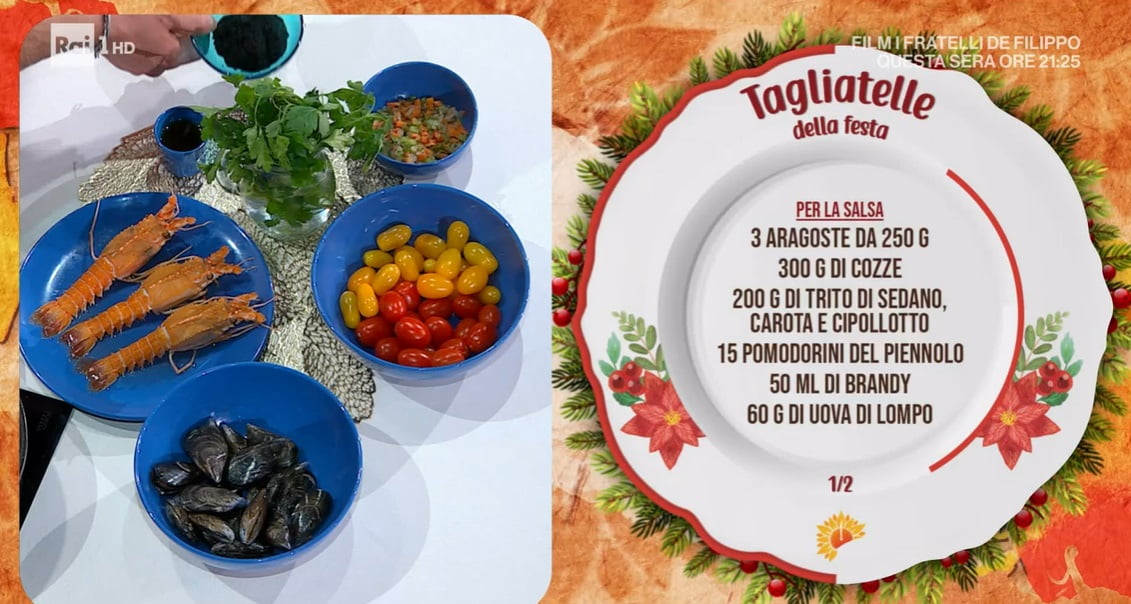 - 3 aragoste da 250 g, 300 g cozze, 200 g trito di sedano, carota e cipollotto, 15 pomodorini del Piennolo, 50 ml brandy, 60 g uova di lompo, prezzemolo, olio, sale e pepe