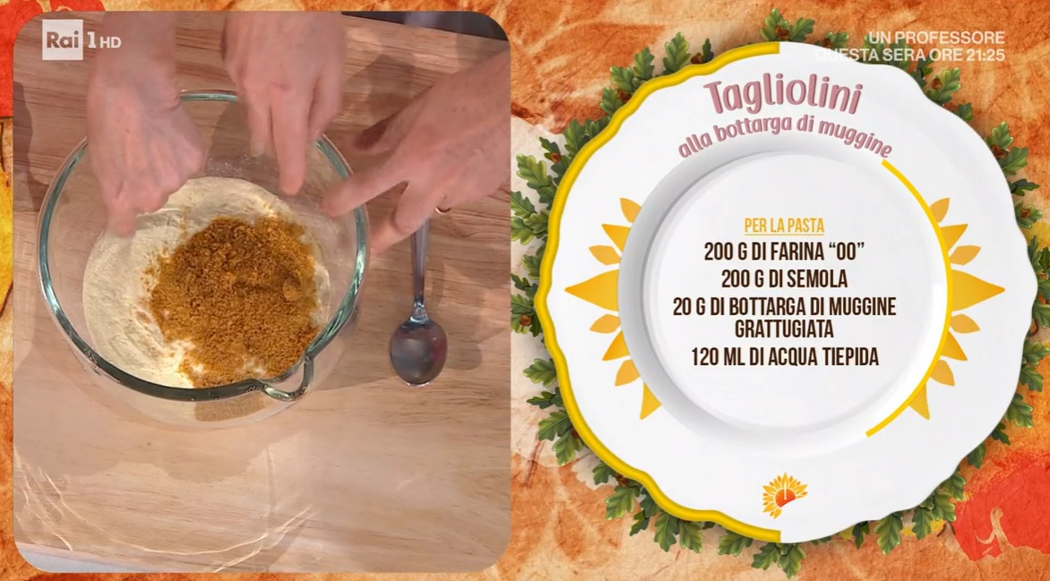 - 200 g farina 00, 200 g semola, 20 g bottarga di muggine, 120 ml acqua tiepida