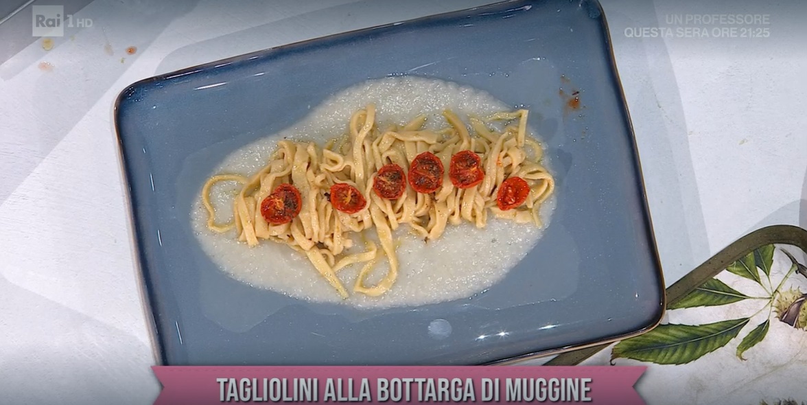 Prepariamo la pasta miscelando la farina e la semola con la bottarga grattugiata finemente. Aggiungiamo l’acqua tiepida e lavoriamo fino ad ottenere un panetto liscio ed omogeneo. Avvolgiamo nella pellicola e lasciamo riposare almeno mezz’ora. Tiriamo la sfoglia sottile e ritagliamo i tagliolini. Cuociamo in acqua bollente e salata per circa 5-7 minuti.