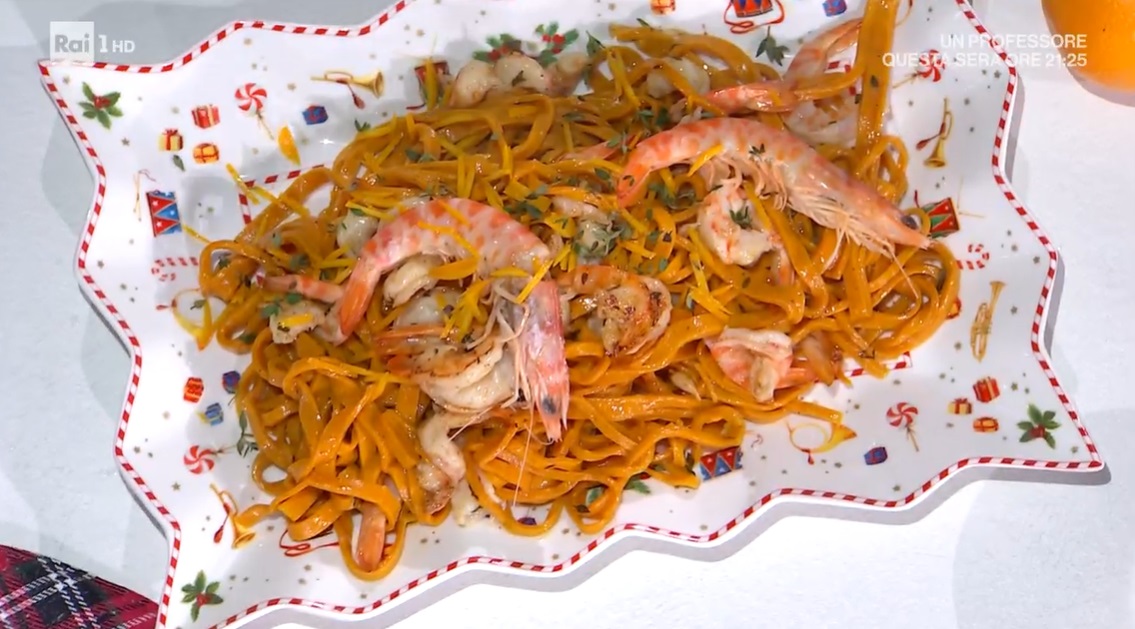 Lessiamo i tagliolini in acqua bollente e salata. Li scoliamo e li saltiamo in padella con il condimento. Decoriamo con le scorzette d’arancia sbollentate ed il timo.