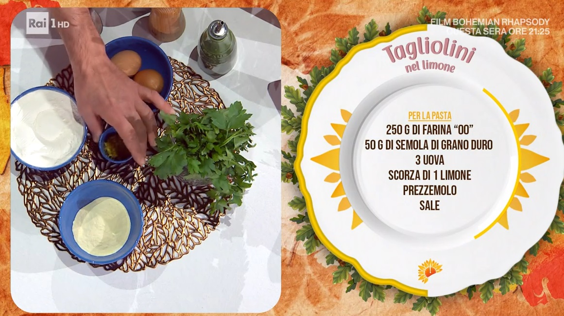 - 250 g farina 00, 50 g semola, 3 uova, scorza di 1 limone, prezzemolo, sale