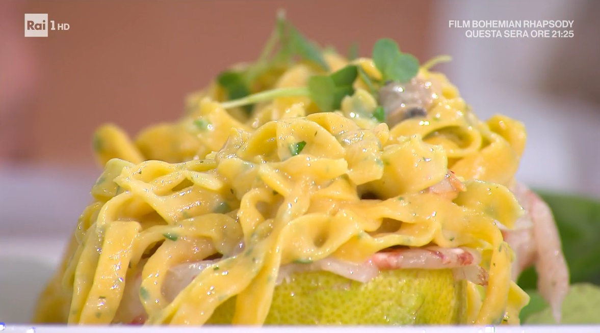 Per servire, tagliamo i limoni grandi a metà e li scaviamo. All’interno del guscio ottenuto inseriamo il carpaccio di gambero preparato. Adagiamo sopra al gambero il nido di tagliolini e finiamo con i germogli.
