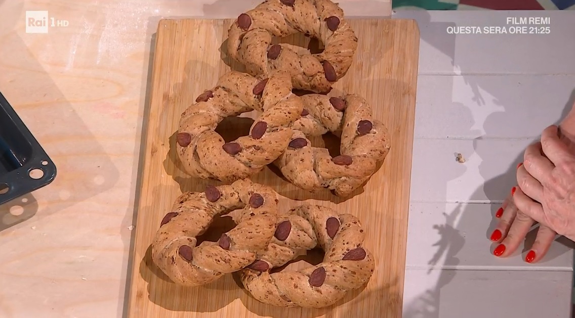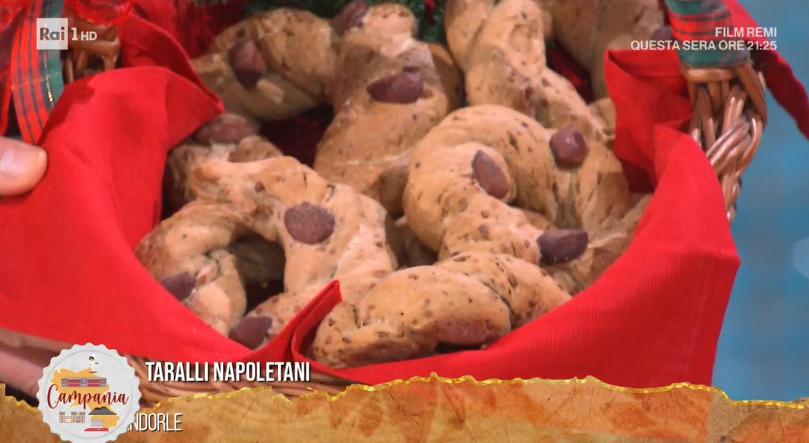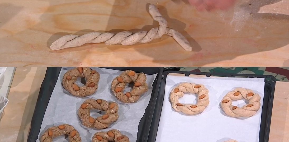 Ricaviamo dei pezzi di pasta da 40-50 g e li stendiamo sul piano, formando dei serpentelli spessi circa 1 cm. Affianchiamo due serpentelli e li intrecciamo tra loro, quindi chiudiamo a ciambella. Disponiamo i taralli su una teglia ed incastoniamo 4-5 mandorle per tarallo. Copriamo e lasciamo lievitare fino al raddoppio.