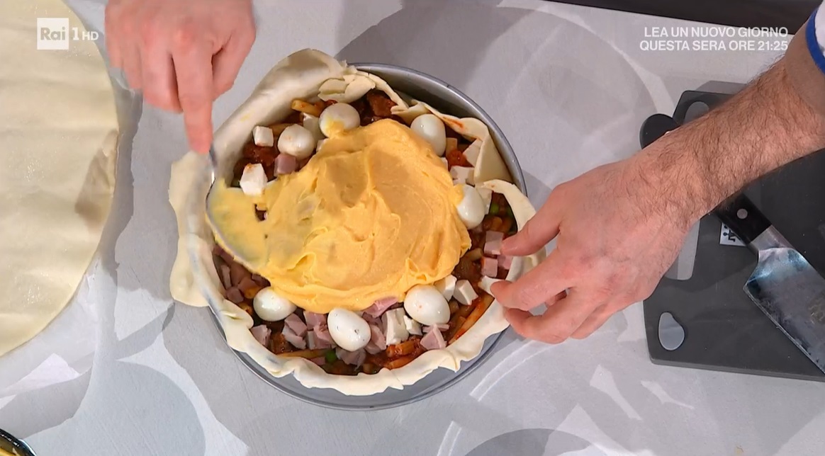 Condiamo i maccheroncini con un po’ di ragù. Foderiamo una tortiera a cerniera con un disco di brisè. Distribuiamo sul fondo metà dei maccheroncini conditi e distribuiamo sopra prosciutto e primo sale a dadini, uova sode a pezzetti e copriamo con uno strato di crema salata. Distribuiamo sopra i maccheroncini rimasti e sigilliamo il timballo con il secondo disco di brisè. Ripieghiamo i bordi e spennelliamo sopra con le uova sbattute con un po’ di panna o latte. Cuociamo in forno caldo e statico a 180° per 40 minuti: deve dorare.
