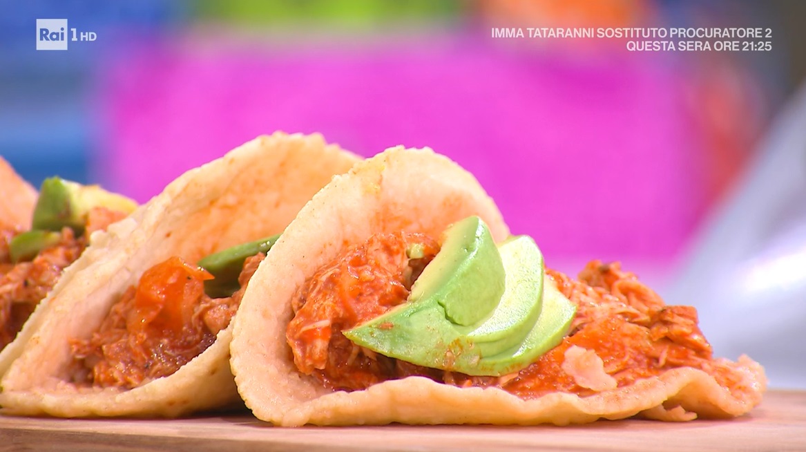 Farciamo i tacos con la tinga di pollo e l’avocado a fette.