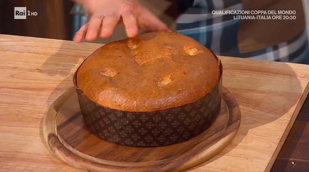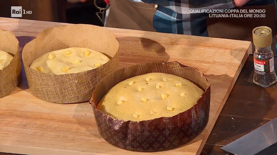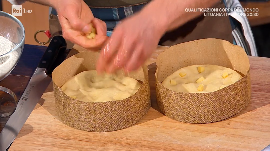 Dividiamo l’impasto in due e ripieghiamo su se stessa ogni palla, in modo da ottenere due sfere lisce. Le inseriamo all’interno di stampi da panettone dai bordi più bassi e schiacciamo con le mani all’interno. Inseriamo in superficie dei cubetti di formaggio. Copriamo e lasciamo lievitare fino al raddoppio: deve formarsi una cupola. Una volta lievitate, disponiamo sopra ancora qualche cubetto di formaggio e cuociamo in forno caldo e statico a 180° per 45 minuti.
