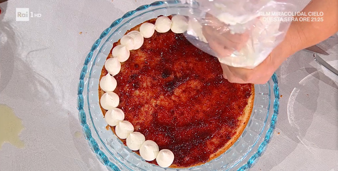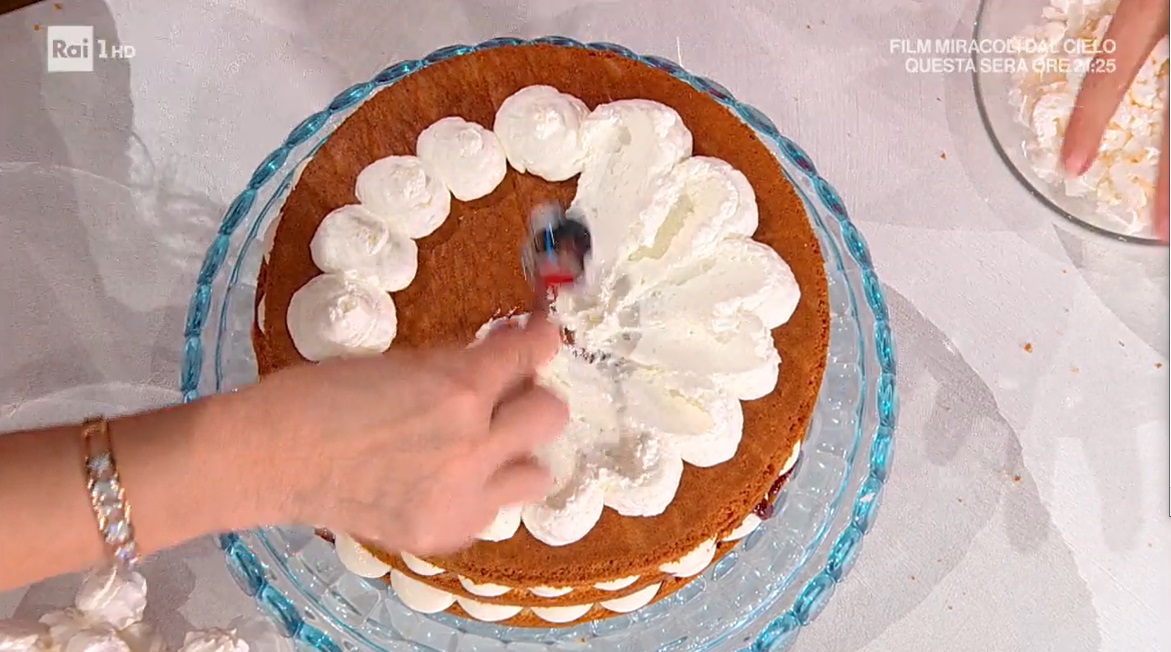 Tagliamo la torta a strati, in modo da ottenere tre dischi. Inzuppiamo il primo disco con la bagna e spalmiamo sopra un leggero strato di confettura di lamponi. Creiamo sopra dei ciuffi di crema di ricotta. Inzuppiamo leggermente anche l’altro disco della torta e spalmiamo sopra ancora della confettura. Creiamo un altro strato di crema di ricotta e finiamo con l’ultimo disco di pan di Spagna, che inzuppiamo leggermente. Sbricioliamo un po’ di meringhe e le facciamo aderire alla crema che fuoriesce dai lati (possiamo evitarlo). Decoriamo la superfice con ciuffi di panna montata, lamponi freschi e meringhe.