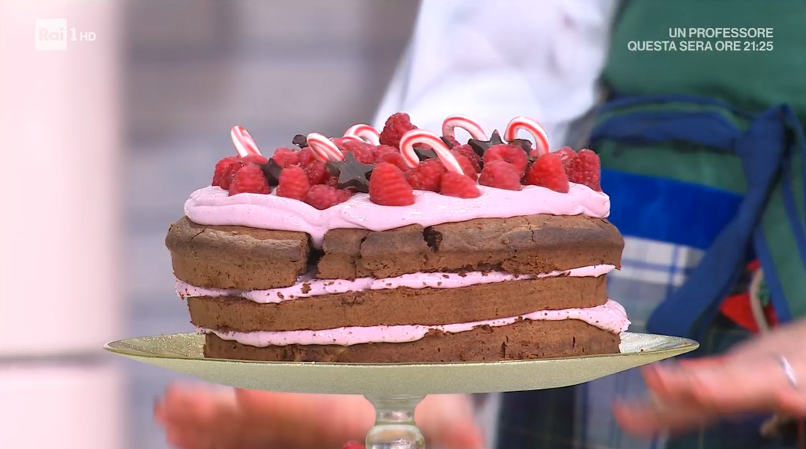 Tagliamo la torta ormai fredda in tre dischi. Alterniamo dischi di torta al cioccolato e crema ai lamponi. Finiamo con uno strato di crema, lamponi freschi e decorazioni a piacere.