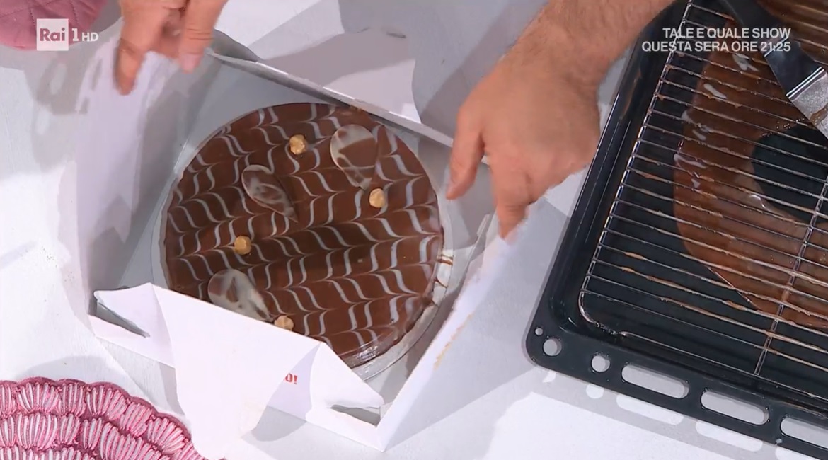 In una tortiera posizioniamo un disco di pan di Spagna alle nocciole alla base. Versiamo sopra un po’ di mousse al cioccolato. Inseriamo al centro l’inserto di croccante e mousse alla nocciola e copriamo con la restante mousse al cioccolato. Livelliamo e congeliamo. Sformiamo la torta e versiamo sopra la glassa a 35°.