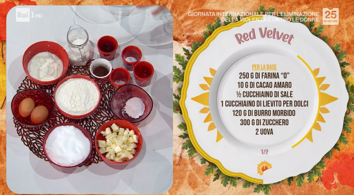 - 250 g farina 0, 10 g cacao amaro, mezzo cucchiaino di sale, 1 cucchiaino di lievito per dolci, 120 g burro morbido, 300 g zucchero, 2 uova, 120 g yogurt bianco naturale, 120 ml latte, colorante rosso in gel, 1 cucchiaino di bicarbonato, 1 cucchiaino di aceto bianco, sale