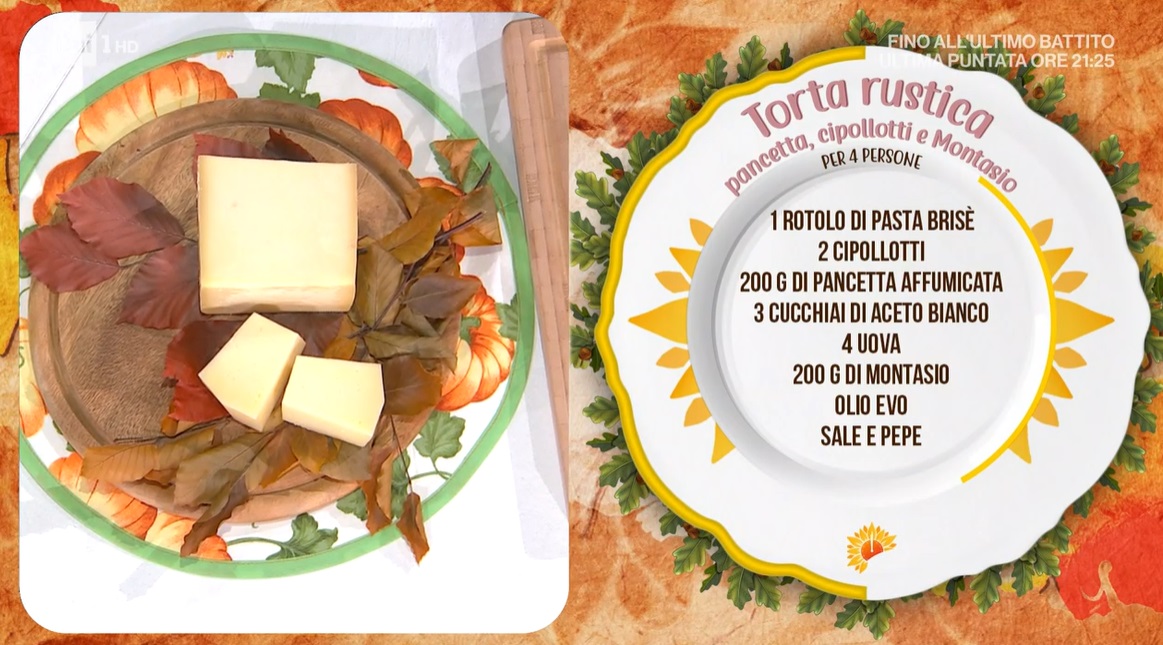 - 1 rotolo di pasta brisè, 2 cipollotti, 200 g pancetta affumicata, 3 cucchiai di aceto bianco, 4 uova, 200 g montasio, olio evo, sale e pepe