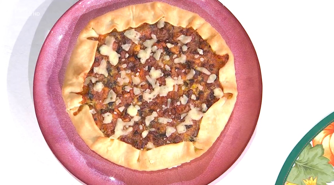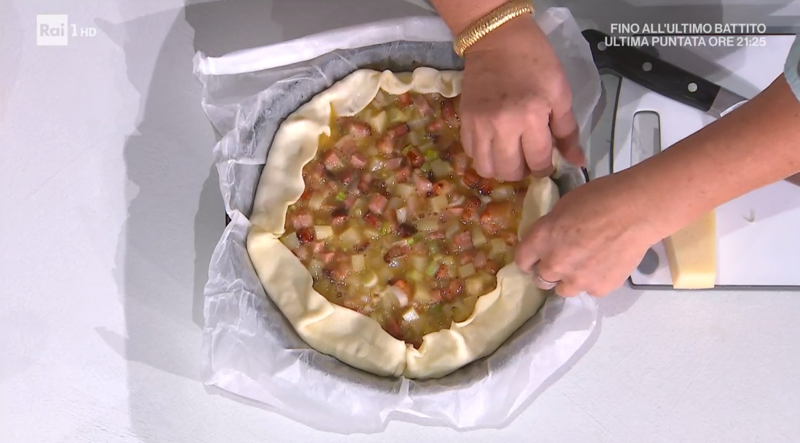 Stendiamo il disco di brisè all’interno di una tortiera per crostate con carta forno e bucherelliamo il fondo con una forchetta. Versiamo all’interno il ripieno e lo livelliamo. Cuociamo in forno caldo a 180° per 25 minuti circa: il fondo dev’essere ben dorato.