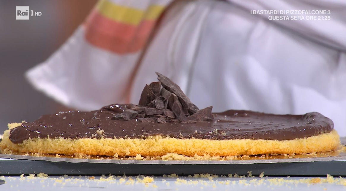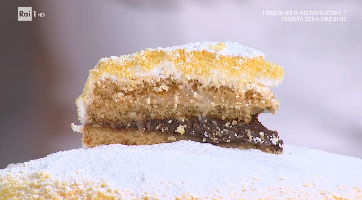 Tagliamo i pan di Spagna a metà, in modo da ottenere 4 dischi. Inzuppiamo il primo disco di pan di Spagna con la bagna al rum. Spalmiamo sopra la crema al cioccolato e mettiamo al centro un po’ di scaglie di cioccolato, in modo da formare una montagnola. Sovrapponiamo un secondo disco, che inzuppiamo: dobbiamo formare una sorta di cupoletta. Spalmiamo sopra la crema al marsala e formiamo una seconda montagnetta di scaglie di cioccolato al centro. Finiamo con l’ultimo disco di pan di Spagna. Spalmiamo esternamente la panna montata (ma possiamo usare anche le creme avanzate, al cioccolato o marsala), in modo da ricoprire tutta la torta. Sbricioliamo finemente il disco di pan di Spagna avanzato e lo spolveriamo su tutta la torta. Finiamo con lo zucchero a velo.