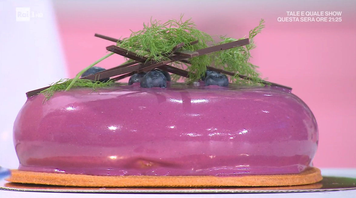 All’interno della tortiera, formiamo un primo strato di bavarese al cioccolato. Inseriamo all’interno l’inserto di mirtilli e copriamo con altra bavarese. Congeliamo. Sformiamo e versiamo sopra la glassa ai mirtilli. Posizioniamo la torta su un disco di pasta frolla e decoriamo a piacere.