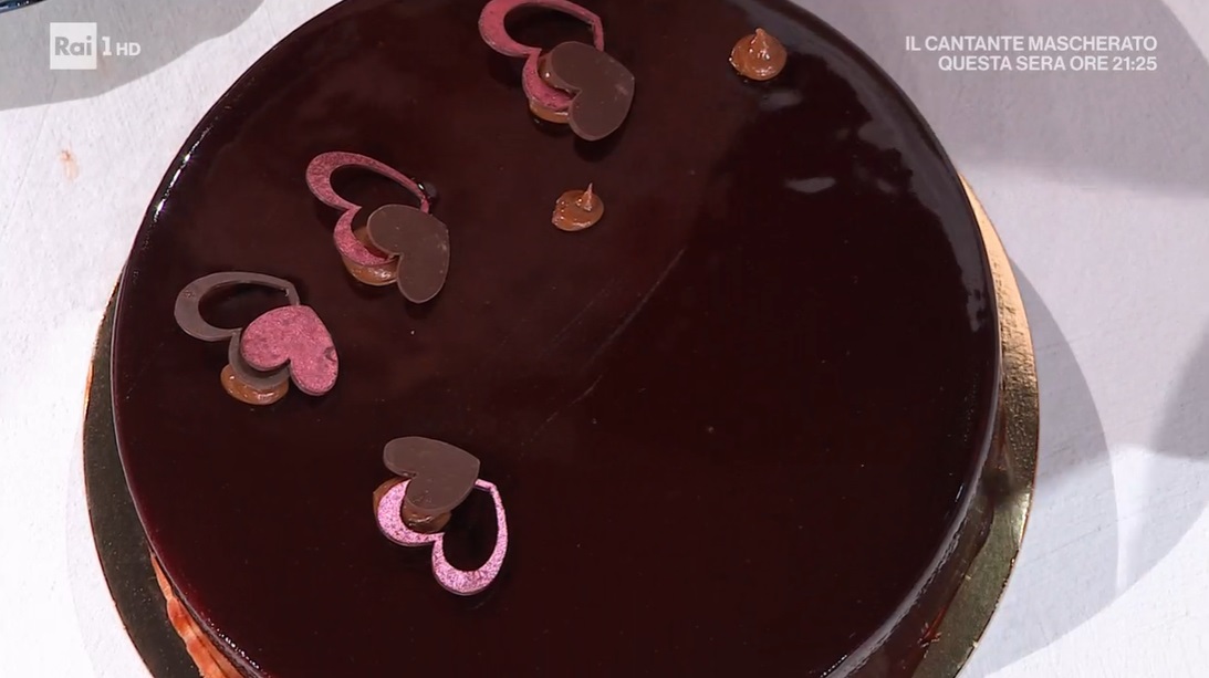 All’interno di uno stampo, sul fondo, posizioniamo il disco di croccantino. Formiamo sopra uno strato di mousse al cioccolato. Inseriamo i cuoricini al lampone e copriamo con altra mousse. Sovrapponiamo un disco di pan di Spagna inzuppato alla vaniglia, spatoliamo con poca mousse e congeliamo. Sformiamo la torta e coliamo sopra la glassa a 30°.
