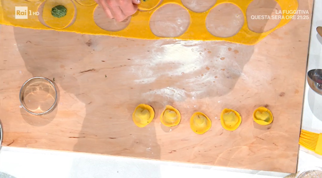 Tiriamo la sfoglia sottile, ritagliamo dei dischetti del diametro di circa 6 cm. Adagiamo su ogni disco una noce di ripieno e chiudiamo a mezzaluna e, successivamente, a cappelletto. Sigilliamo all’interno il ripieno e facciamo uscire tutta l’aria. Li cuociamo in acqua bollente e salata.